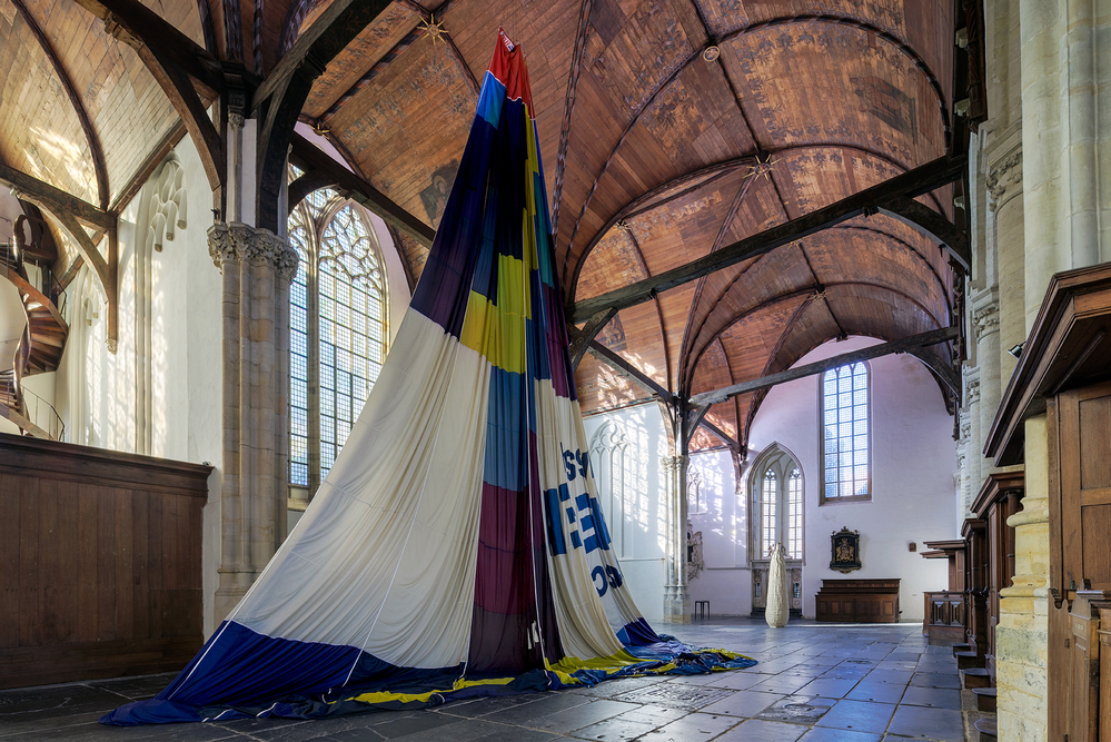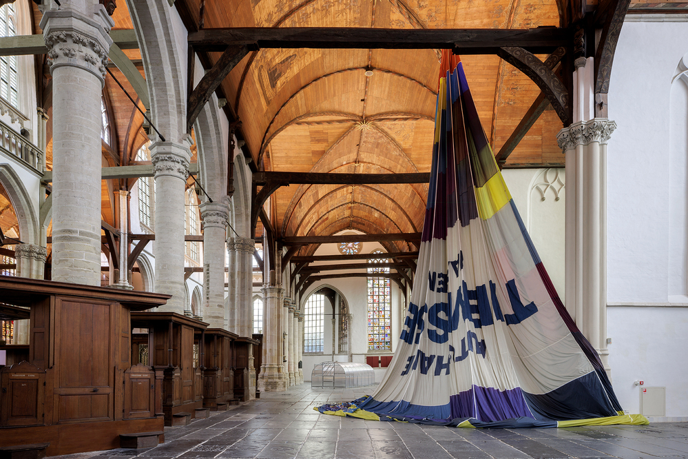 Nuur considers the function and meaning humans assign to objects as a learned concept that can be re-moulded into a new meaning. This gives room to stretch the meaning of the hot-air balloon that forms the entrance to the exhibition. The balloon is a literal mode of transportation for the balloonist and a metaphorical one for the audience. She once lifted balloonists up and touched the clouds. Now, she is here on earth, witness to a visit to heaven, taking us into the space of the Oude Kerk.