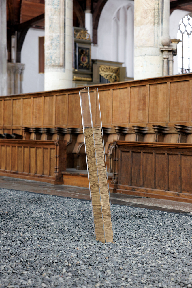 A sea of pebbles awaits your footsteps. The round beach pebbles make a sound when you walk on them. Without words, they guide you to a column where Navid Nuur has left a note for you. Read his message, then take two pebbles with you from the church and into the world.