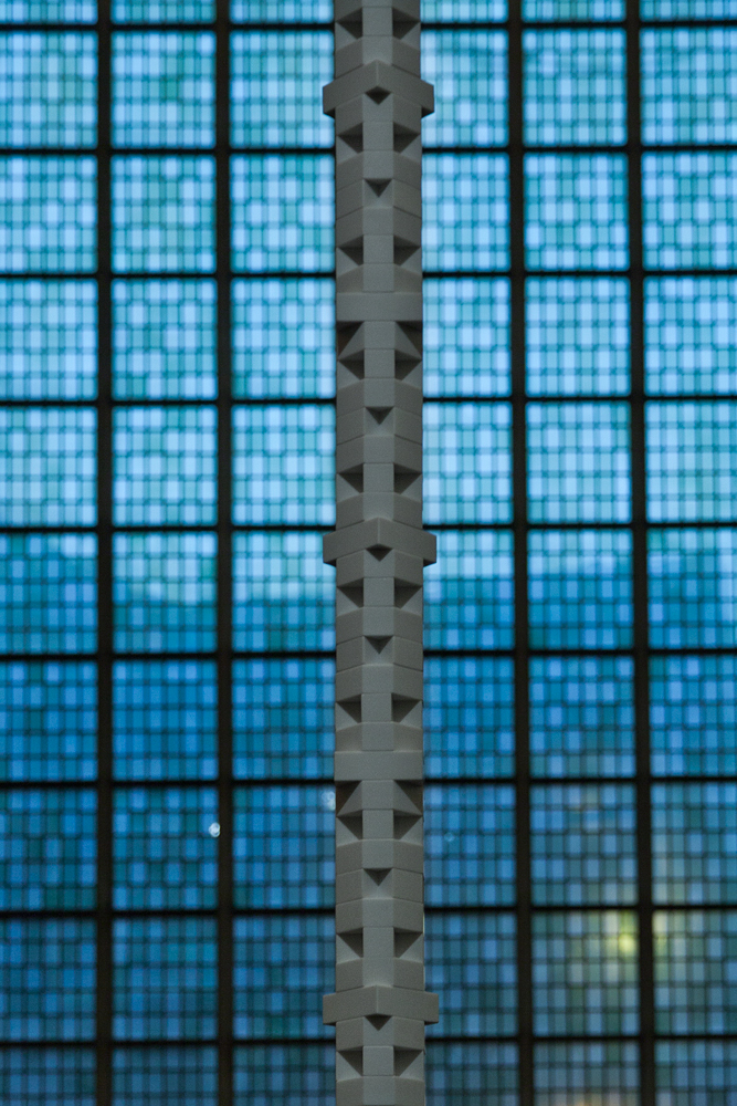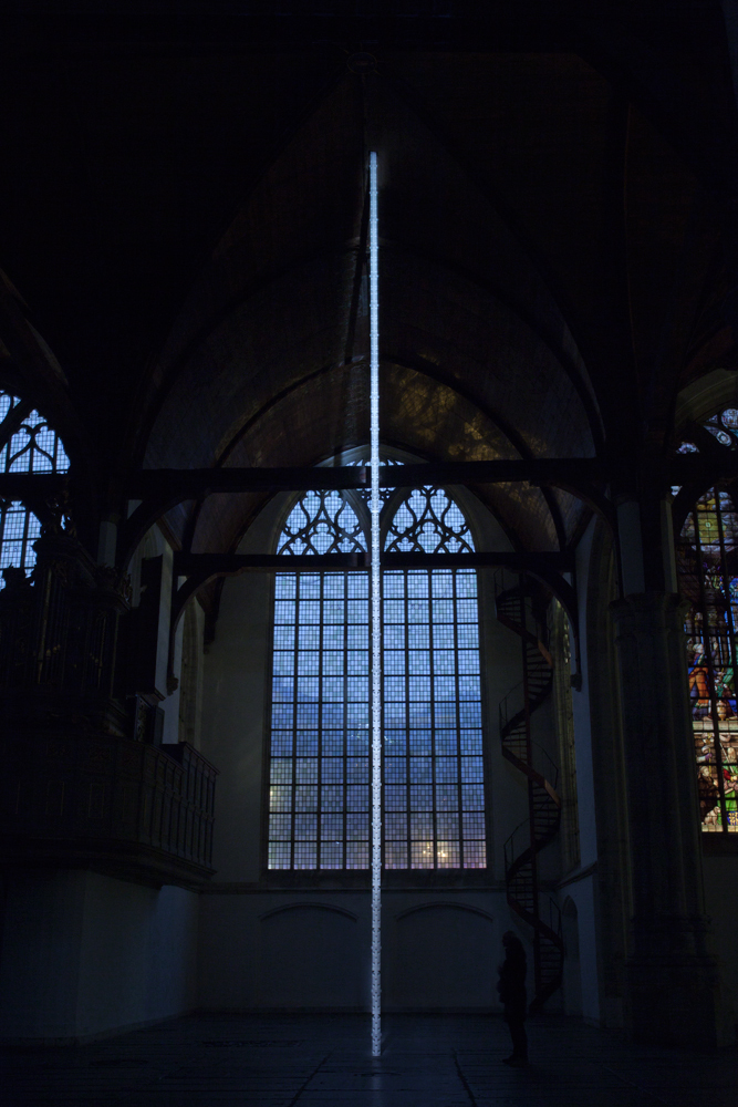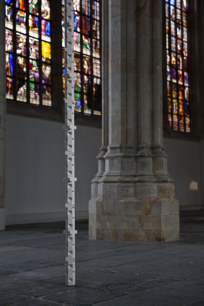 The ongoing project Column Untitled, consisting of stacked white marble stones, is the physical centre of the exhibition. The stone forms represent stages in the transition between square and circle. Evoking a sensation of infinity, the column extends from the gravestone floor to the vaulted ceiling. The original installation was built using hundreds of elements to form an 8-meter pillar. For the Oude Kerk, Kruip extended the column to a height of 18 meters, the exact height of the Saint George (Joris) chapel. The rhythmic stacking and repetition emphasize not only the notion of infinity, but also references ritual - which exists by virtue of an imaginary endless repetition of actions. The elements of the column are based upon a pillar of a temple in Hampi (India).