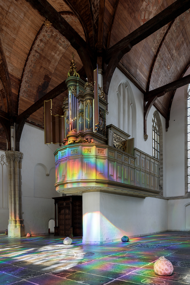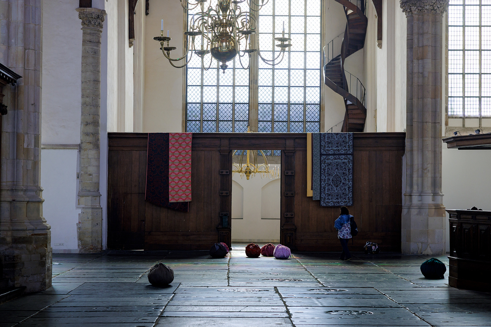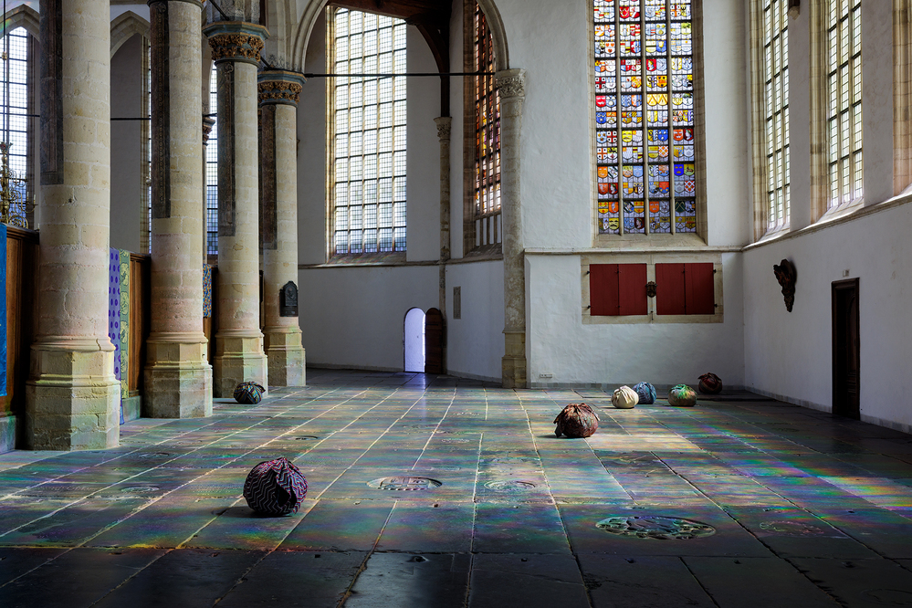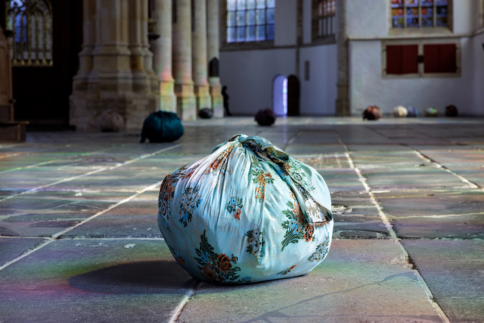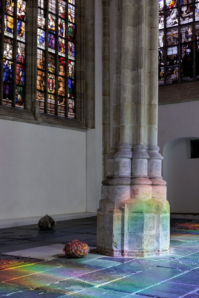 Kimsooja has gained international acclaim for her poetic installations that address important issues of our time, such as migration, displacement, longing for a home, and the search for identity. Especially for the Oude Kerk, she created a new series of her iconic textile bundles (bottari), inspired by the traditional Korean wrapping cloths in which people carry their cherished belongings during travel. The bundles are filled with clothes from Amsterdam’s many communities. She has also covered the over 44,000 panes of the soaring windows with iridescent film, transforming sunlight into a sea of rainbow colours. To Breathe – Mokum offers a meditative experience that invites reflection on uprooting and returing home as well as on what we take with us and leave behind.
