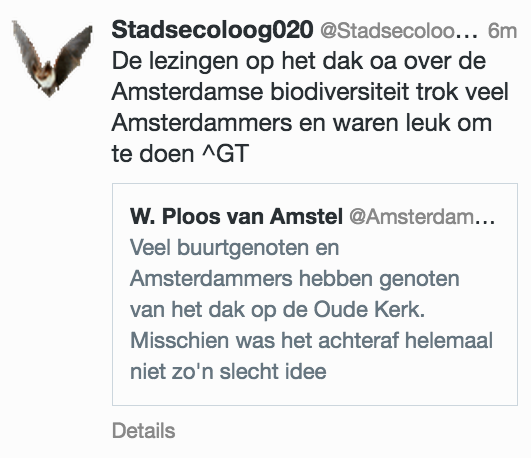 As an urban ecologist, Geert Timmermans knows every bit of nature in Amsterdam and beckons us from the roof of the Oude Kerk to discover the capital's fascinating biodiversity. Amsterdam is bursting with plants and animals: there are over 10,000 species in the city. It is crawling with necklace parakeets, salamanders, and Chinese woolly crabs, even in the city centre. Moreover, every year new animal species are discovered that have never been seen there before or have been gone for a long time. During this presentation, visitors heard about the many animals present in the city and around the Oude Kerk.