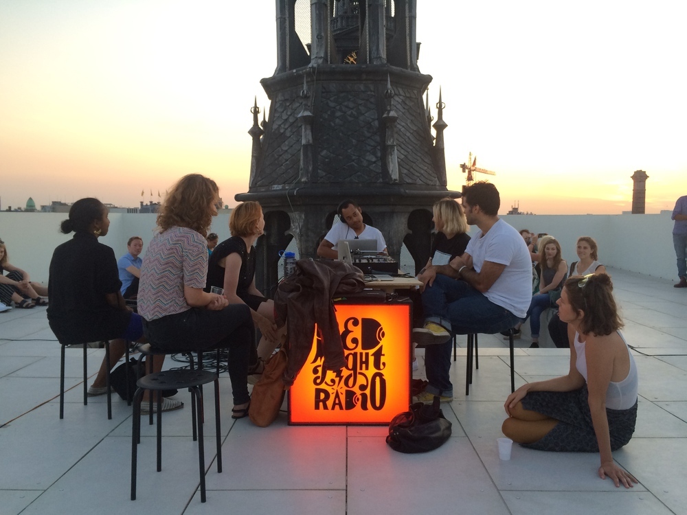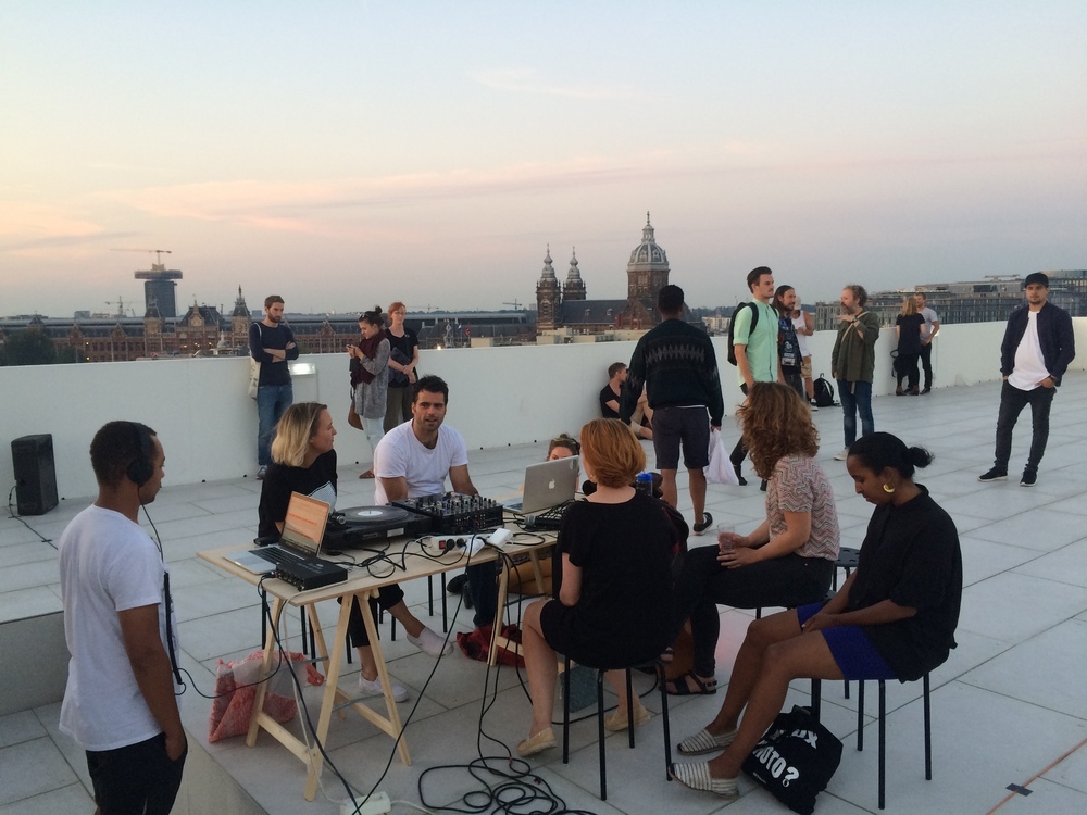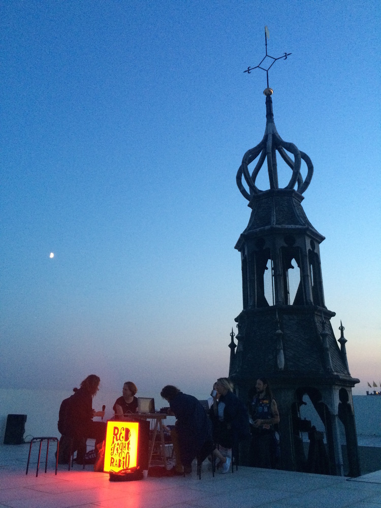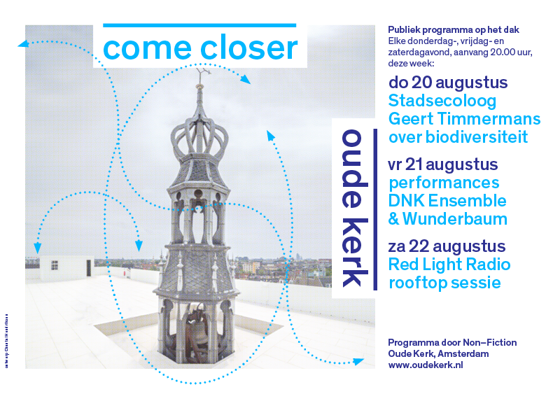 At this point, Red Light Radio (2010-2020) had been broadcasting from a former prostitution window on Oudekerksplein for almost five years. The online radio station had become the go-to place for music-loving Amsterdam - many local DJs and artists had their own radio show there, but artists from abroad were also eager guests. Dark metal, obscure disco or the latest electronic music: Red Light Radio's selectors (unlike Spotify) let you hear music you didn't know you were looking for yet. During this Come Closer , the studio moved into the air for once: from the Oudekerksplein to the roof of the Oude Kerk. In conversation with Radna Rumping, seven resident DJs here shared a song they had chosen specifically for this occasion. Featuring Amal Alhaag (Africa Is Hot), Bea1991, Calypso Steve (Redlight Records), Femke Dekker (Tuesday Night Prayer Meeting), Marcel Vogel (Lumberjacks In Hell), Margie and Rege Satanas. The audience listened to the broadcast on the spot.
