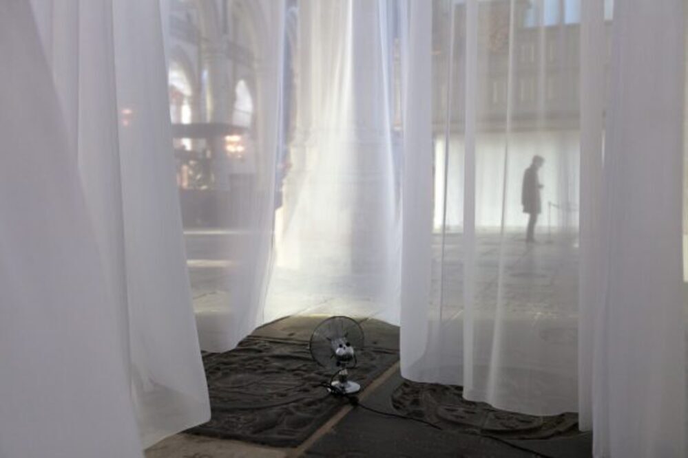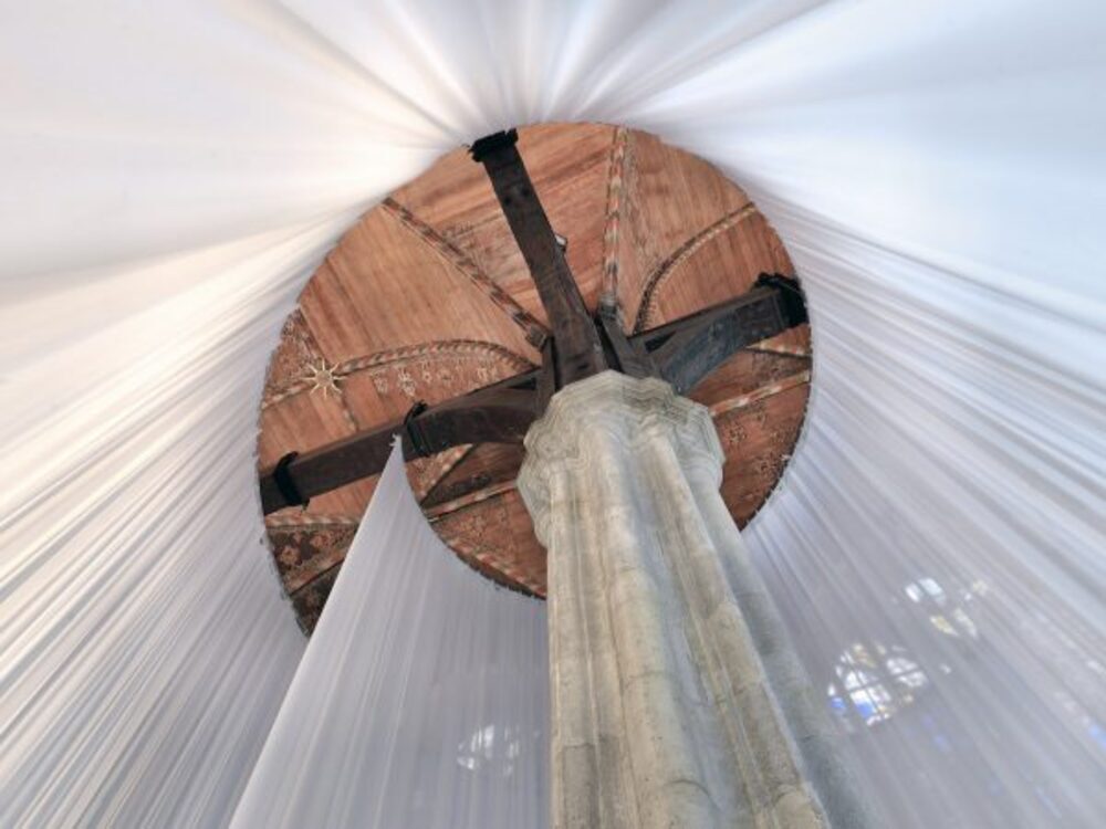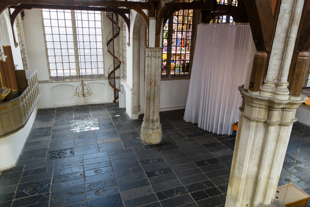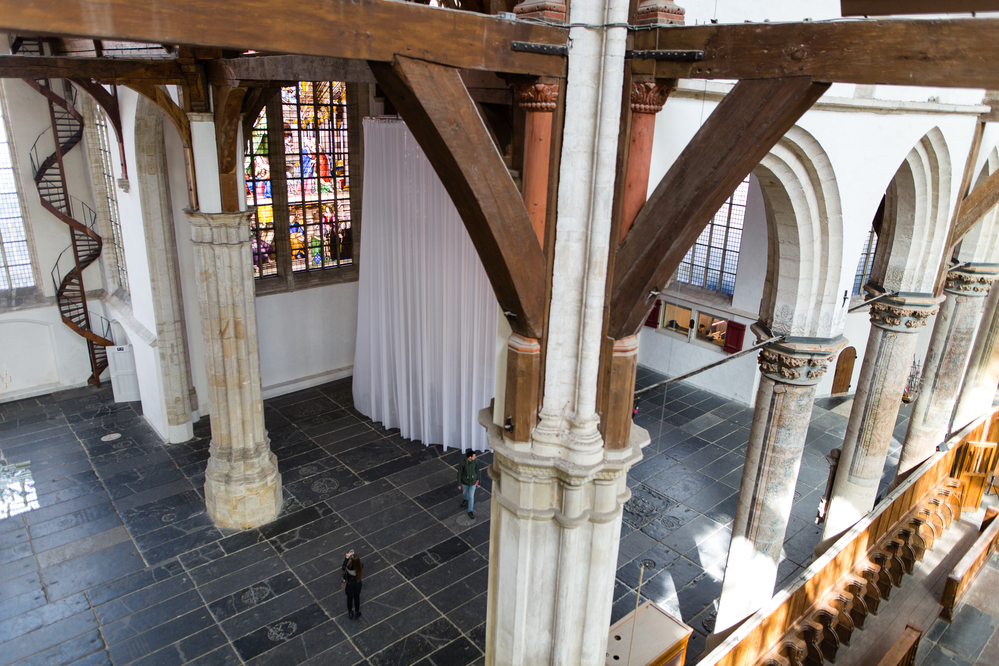 Meter-long, semi-transparent canvases hung in the Lady Chapel, forming a trail or labyrinth around the thickest colum in the Chapel in which the visitor disappeared and appeared. The cloths moved gently in the wind that blew out of a number of fans. The canvases hung high (about 7 meters) and camouflaged parts of the church, making the architecture sometimes visible, sometimes invisible in an unexpected way.