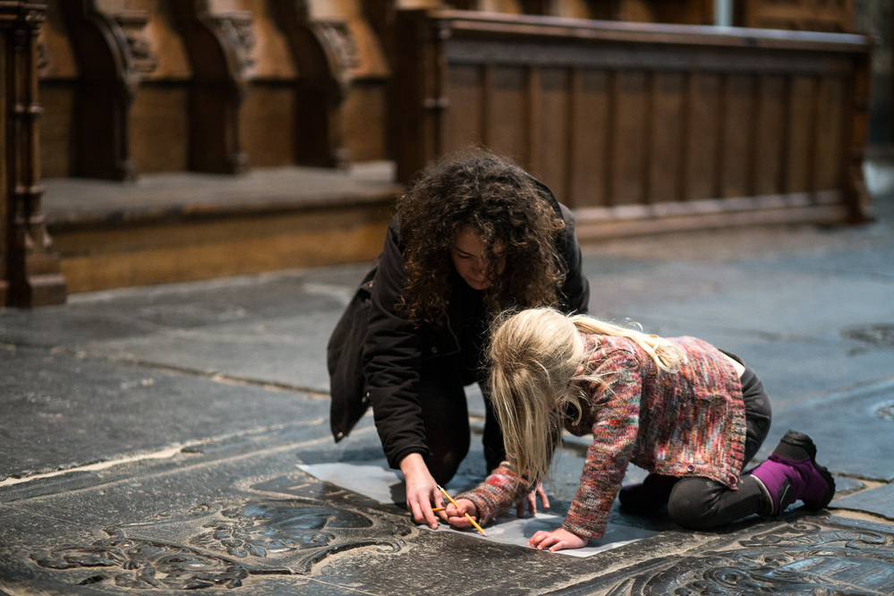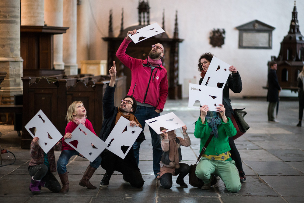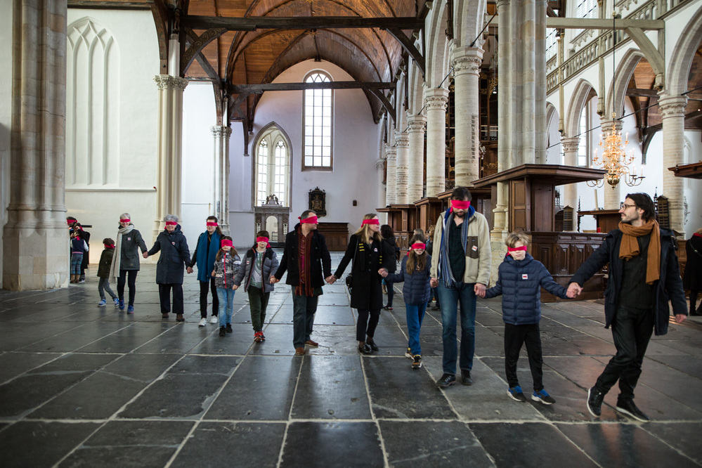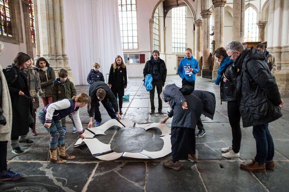 This series of Come Closer gatherings was suitable for all ages, specifically also for children (from 6 onwards) and was developed by curator Michiel van Iersel in collaboration with architect Lada Hrsak. Participants were invited to discover the building in a sensory way, with their head, hands, and feet. Among other things, the Oude Kerk was experienced lying on the ground - there were exercises during WIC h the eyes remained closed and 'rubbings' of the tombstones were made. The idea was to get to know the space from a surprising perspective, with an eye for the smallest details, and also to get closer to the work of Marinus Boezem - who plays a lot with tilting perspective in his oeuvre and developed five new works for the Oude Kerk. The visitors consisted mainly of small groups of parents with children.
