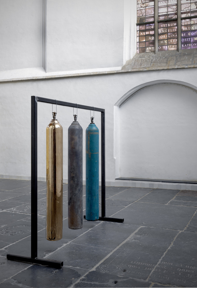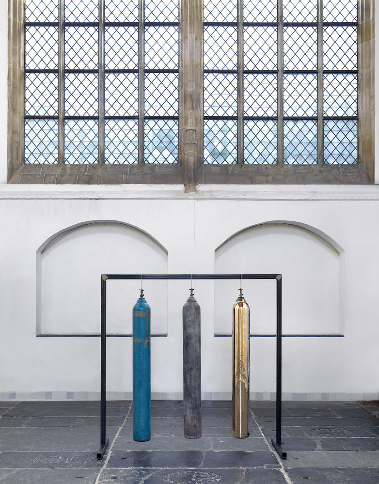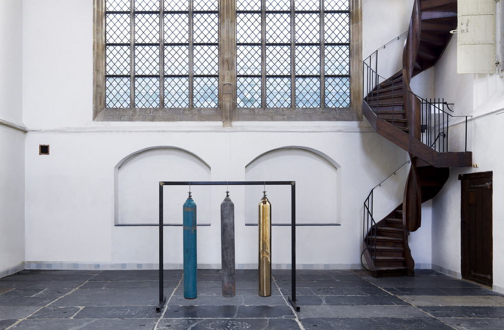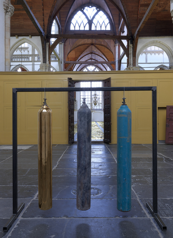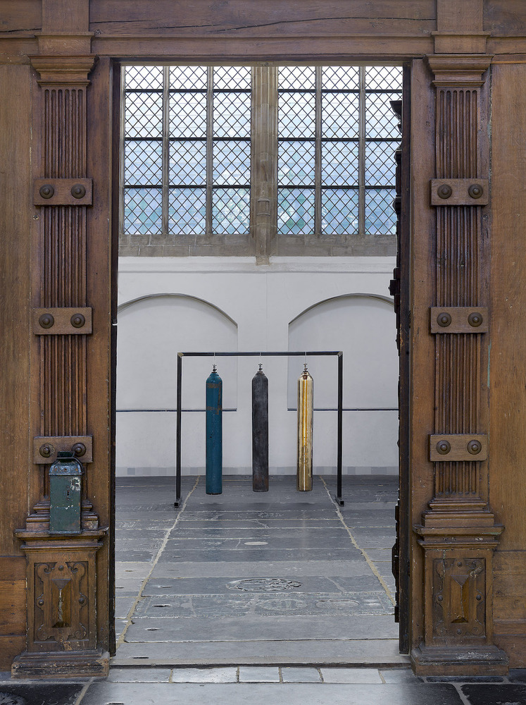 Also part of the installation is the work 'Four Seasons in One Day'. Three oxygen bottles hang in the Sebastian Chapel, one original that was gifted to the artist by the people on the most remote island in the world: Tristan da Cunha, and two replicas cast in bronze. The oxygen bottle washed up on the island was used there as a gong to signal when it was time to go fishing and to alert in case of fire.