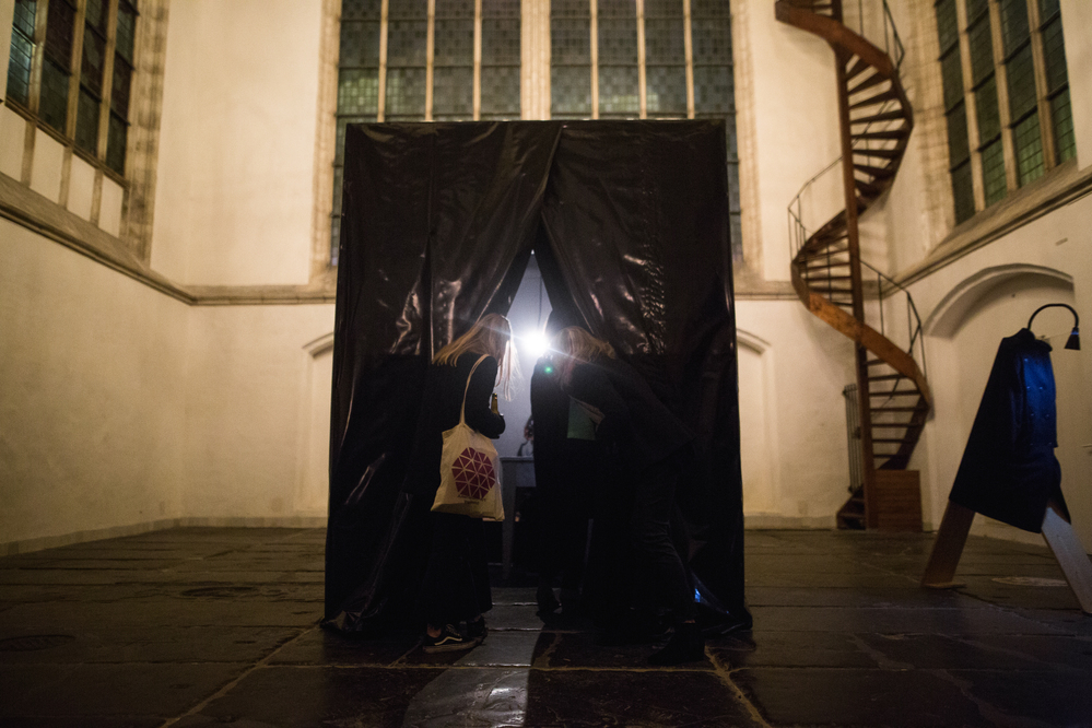 In a contemporary rectangular confessional chair, visitors whispered a number of names of people buried in the Oude Kerk. When whispering, all voices sound alike. To thank the visitors for their sonor / auditory gift, the artist returned a certificate of gratitude. The recorded whispers were heard in the high choir during the exhibition weeks. Over time, all whispers turned into a comprehensive soundscape that remains as an intangible homage. Additionally, the names were printed in a small booklet that was available at the entrance during the exhibition.