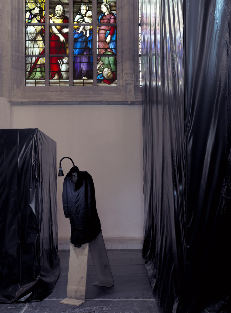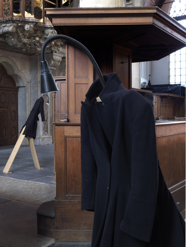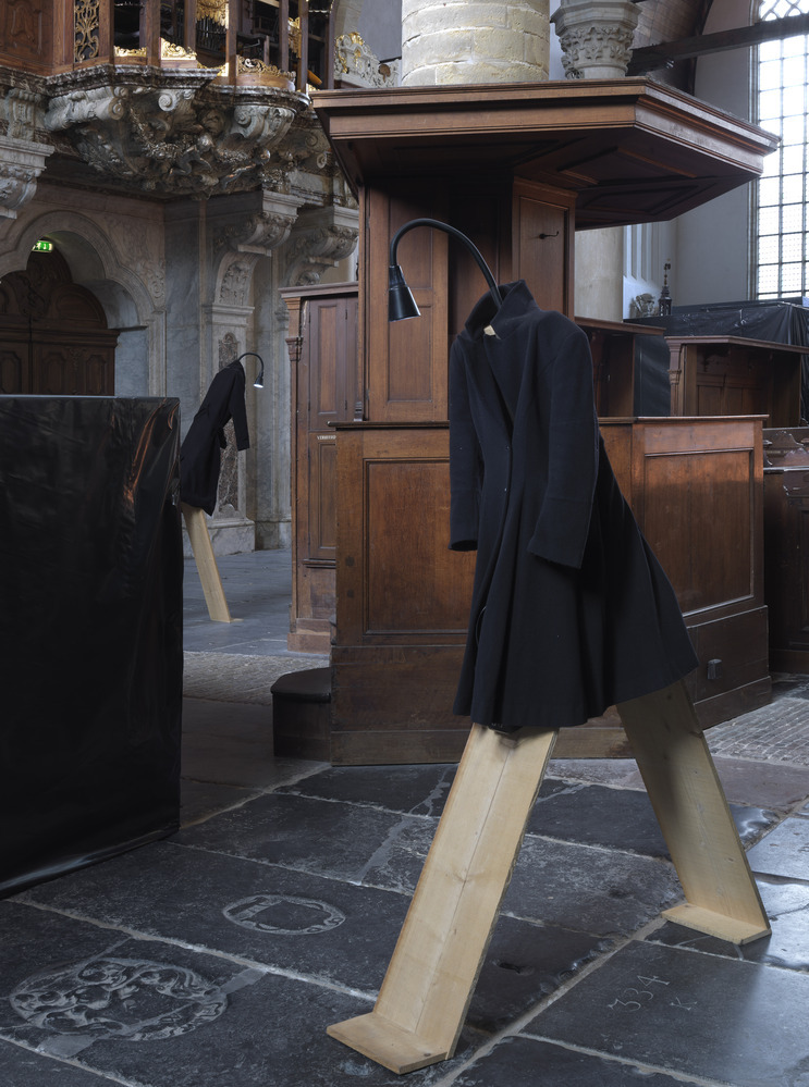 Prendre la parole (2005) was an installation of simple plywood constructions wearing a coat, to resemble a person. Each one had an audio component. When approaching, a question was posed: "Tell me, did you suffer?" Each sculpture asked something different.
