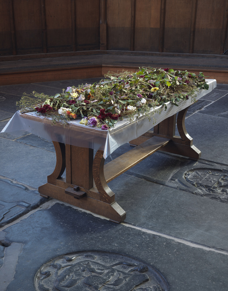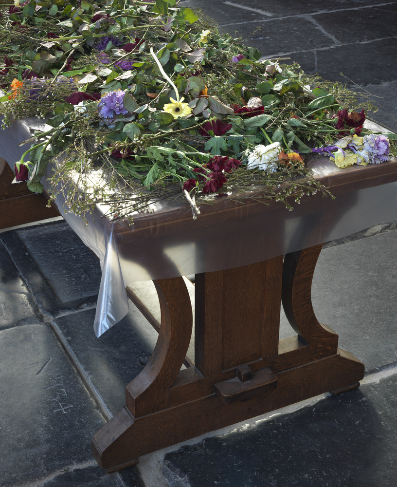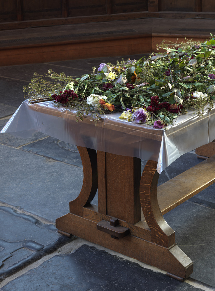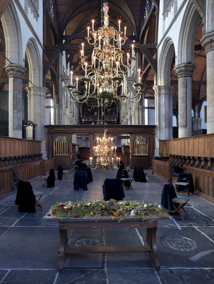 On the spot where the altar stood in the Roman Catholic existence (1306-1576) of the Oude Kerk, the artist laid flowers. The flowers reminded the deceased who have been buried for centuries long as a touching tribute. At the same time, the flowers made one aware of the time behind us. The flowers were dried up and, were conserved by the plastic foil, in an effort to preserve them for upcoming times.
