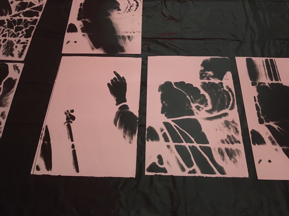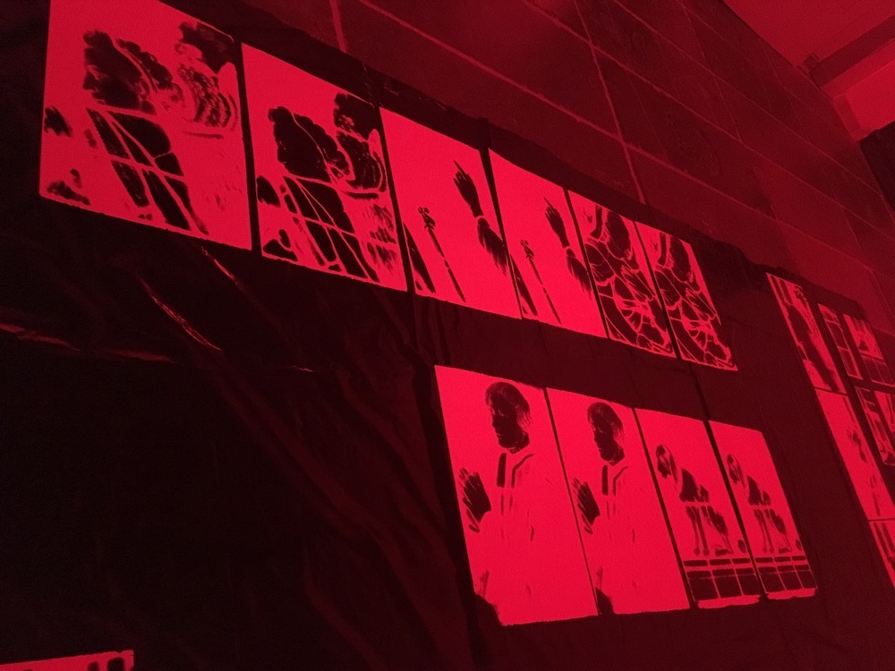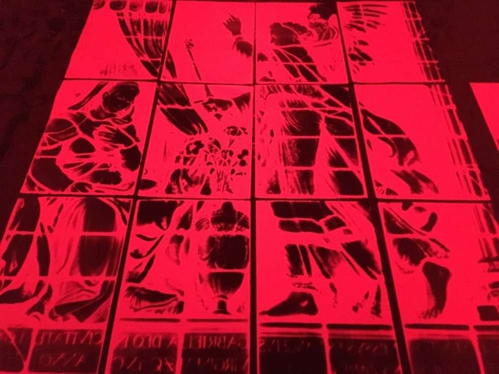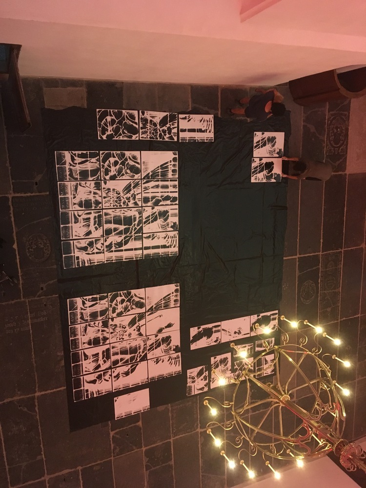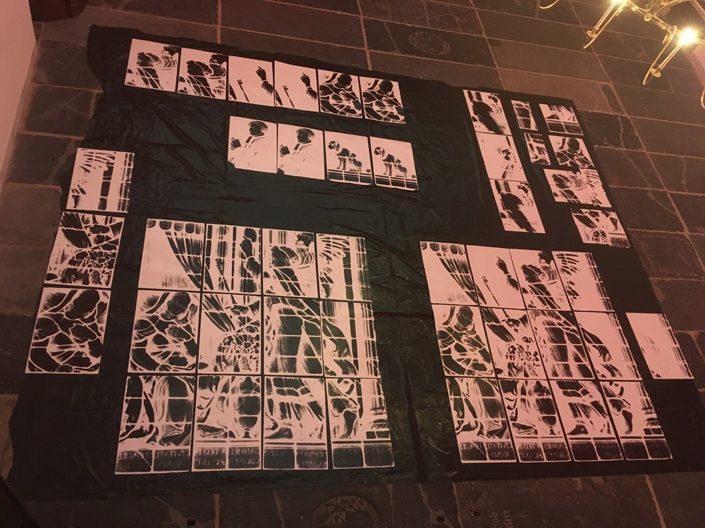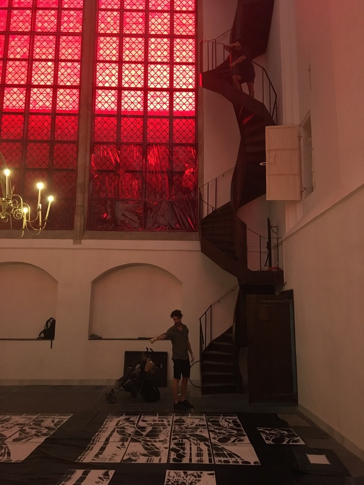 The piece consisted of 14 photographic prints in natural light, generated by the impact of silver salts in combination with the light of the sun. The prints were made over the summer of 2018, by placing photosensitive paper in contact with the stained glass window in the Oude Kerk.