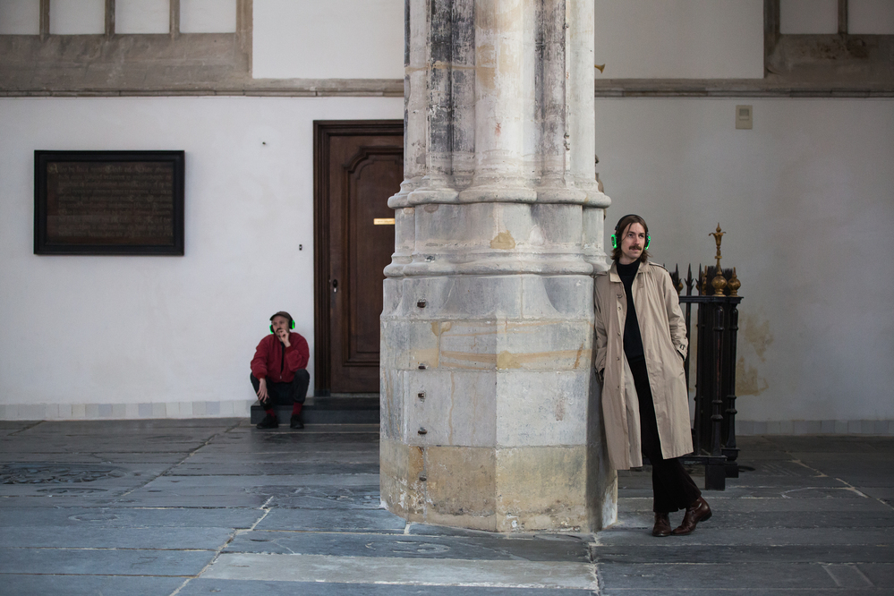 During the last part of the Come Closer program in relation to The Instrument of Troubled Dreams by Janet Cardiff and George Bures Miller, visitors were invited to listen beyond the here and now. On April 12, Pamela Jordan and Jo Kali conducted listening tours, where the "here" was still the space of the Oude Kerk, but the "now" was stretched towards a possible past and a speculative future. Apart from Jordan and Kali's listening tours, a video about Gemini Exit (Beeny's Retirement) was also presented on a screen in the St Sebastian Chapel. The 12.05-minute video, called 'contraband Gemini Exit (Beeny's Retirement)' was edited by Fán Liào, and showed footage from the February edition of Come Closer. Gemini Exit (Beeny's Retirement) was a performance by artist Ivan Cheng with wearable sculptures by Kristoffer Zeiner. The performance reflected on questions of agency without authorship.