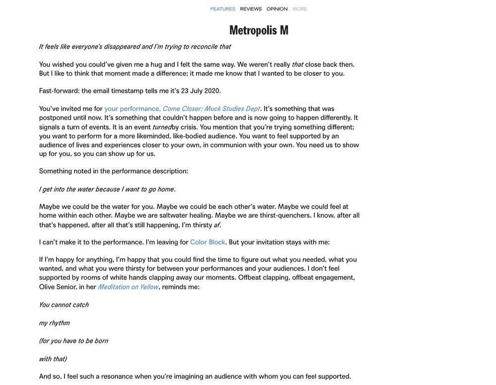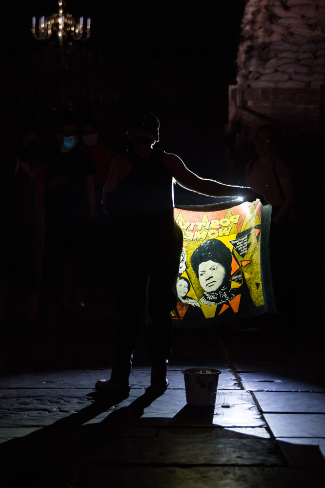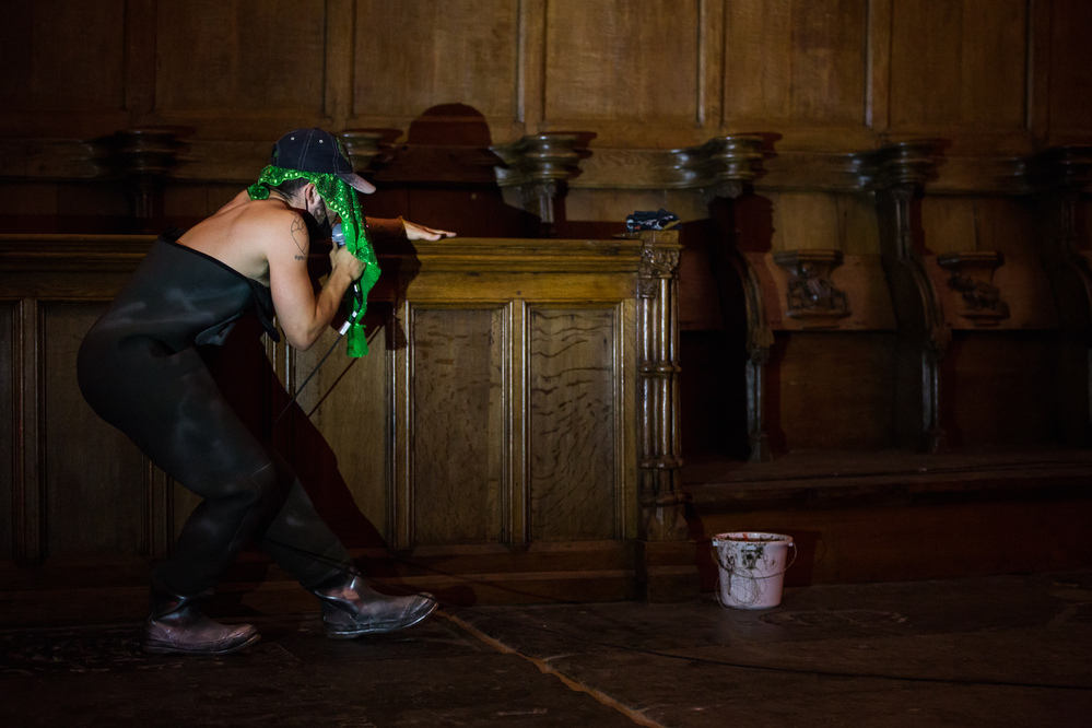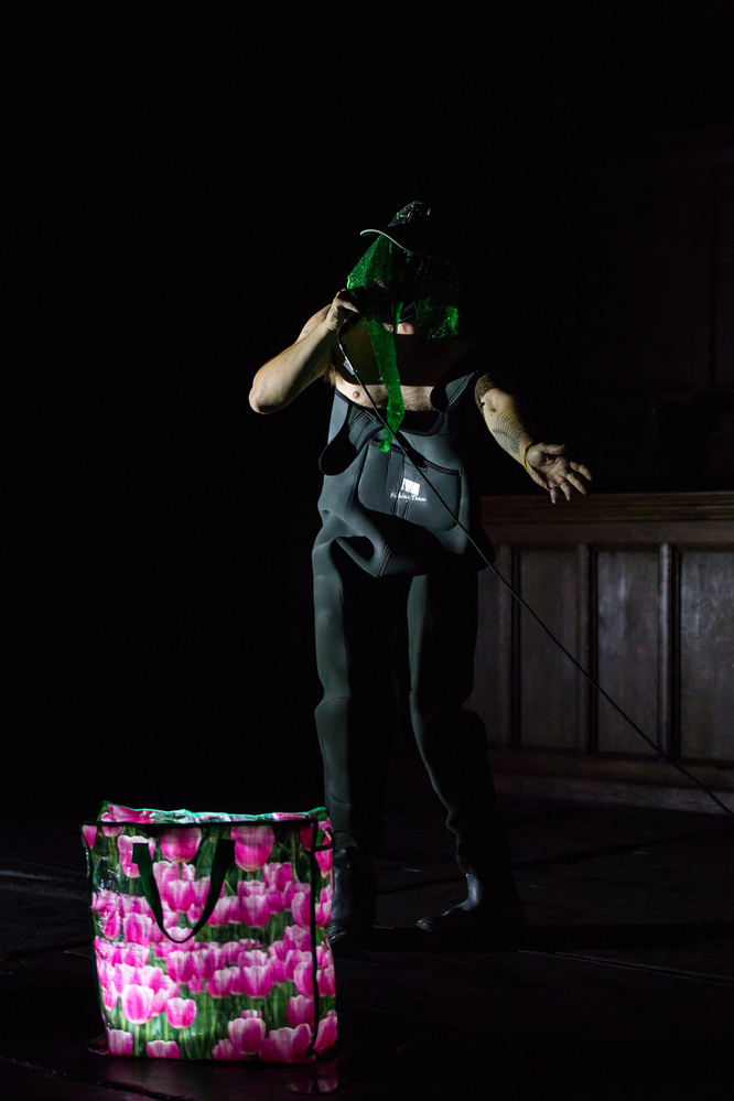 "I get into the water because I want to go home". In recent years, Wyeth has been wading into the water; from an artificial pond near their studio in the Netherlands to the swamps of New Orleans - stirring the low-lying water with their rake releases gases in the air to form new stars from that which 'stinks'. What lays hidden below the surface or in plain sight? Research into toxic water pollution and land reclamation, stories about maroon communities, and the absurdity of a misinterpreted composite identity, were some of the ingredients for this performance's theatrical poem and saturated music."