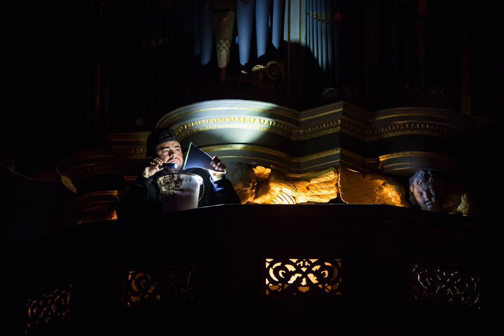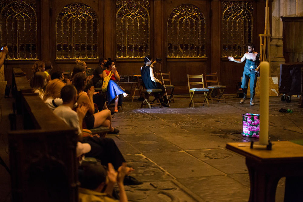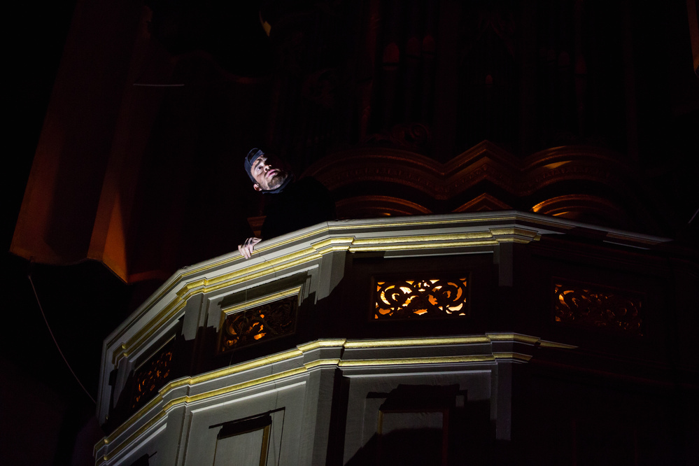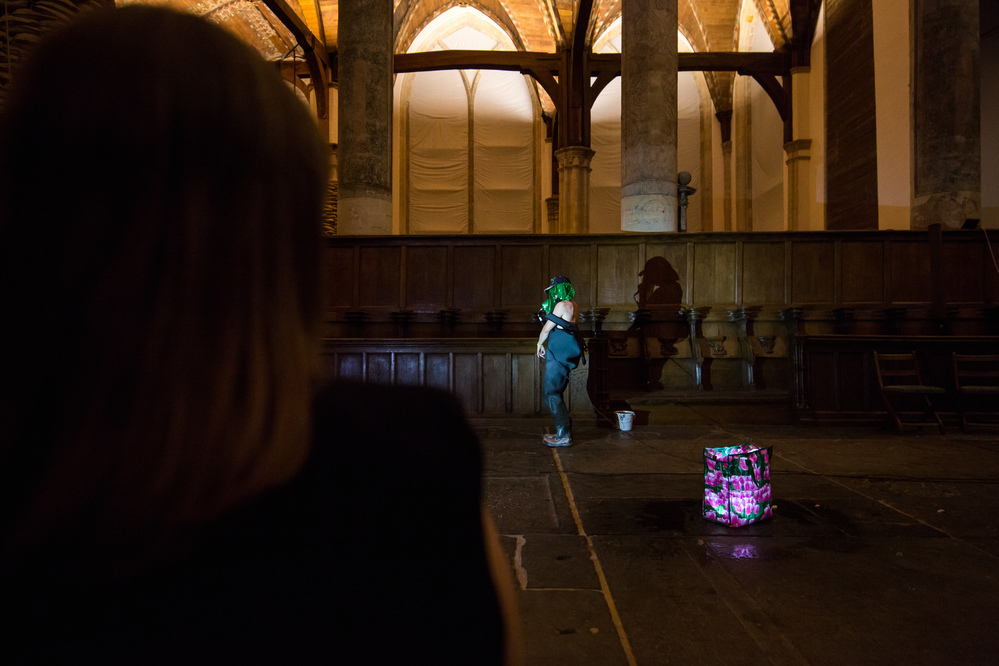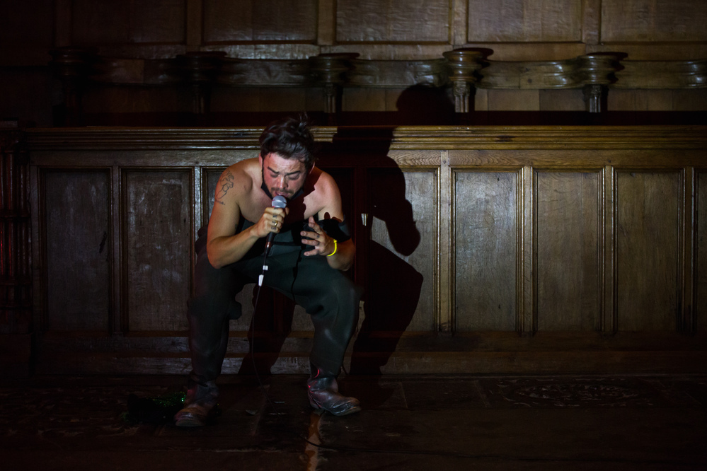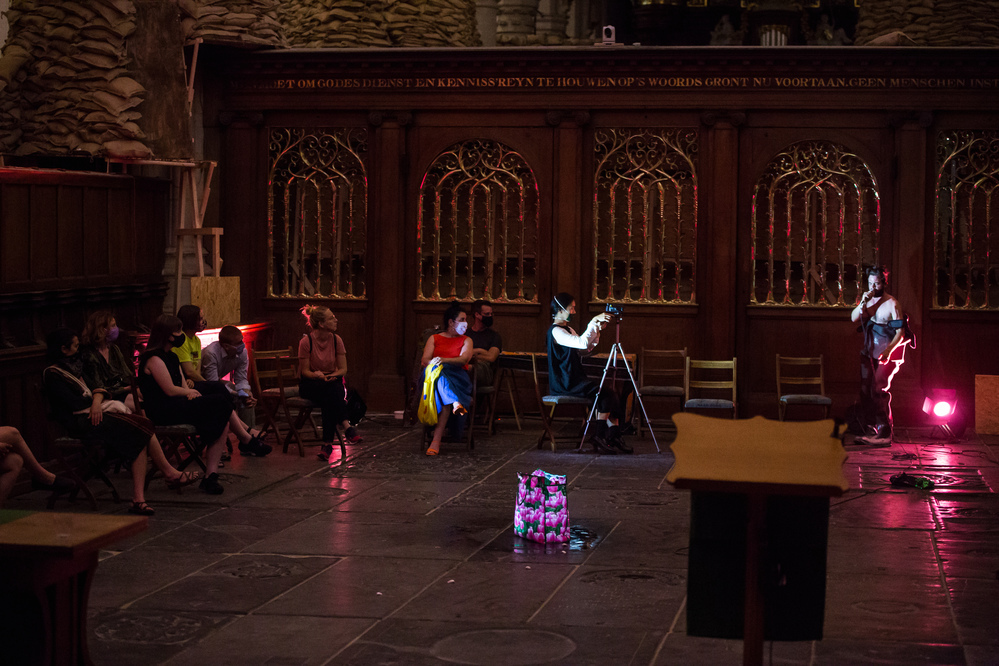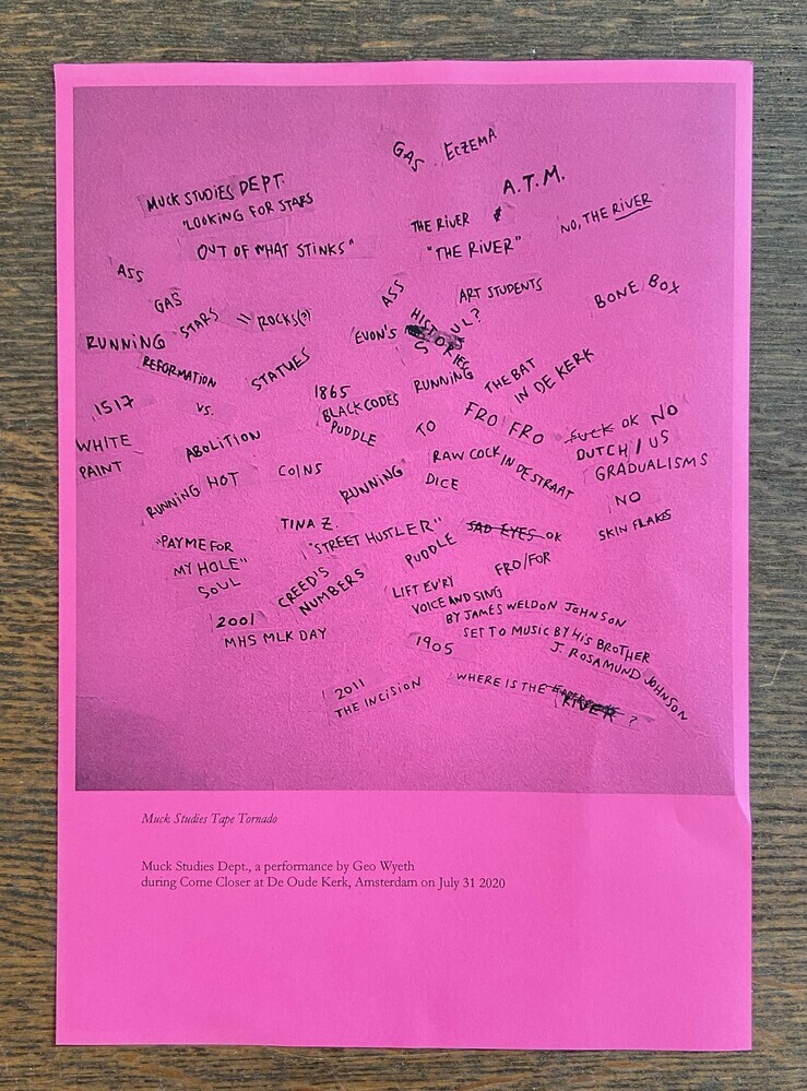A performance by Geo Wyeth as an extension of their long-term project Muck Studies Dept. which combines Black/American music and history, extractive industry research and techniques of investigative journalism. Through this, Wyeth troubled the swampy waters of American racial history and ideas of a homeland. Geo Wyeth (1984, NYC) is an artist and teacher, working in the fields of music, performance, narrative sculpture, and video. The performance moved through the church, with Wyeth also playing the transept organ. In terms of content, it combined earlier texts with new anecdotes and elements that belonged to the Oude Kerk.