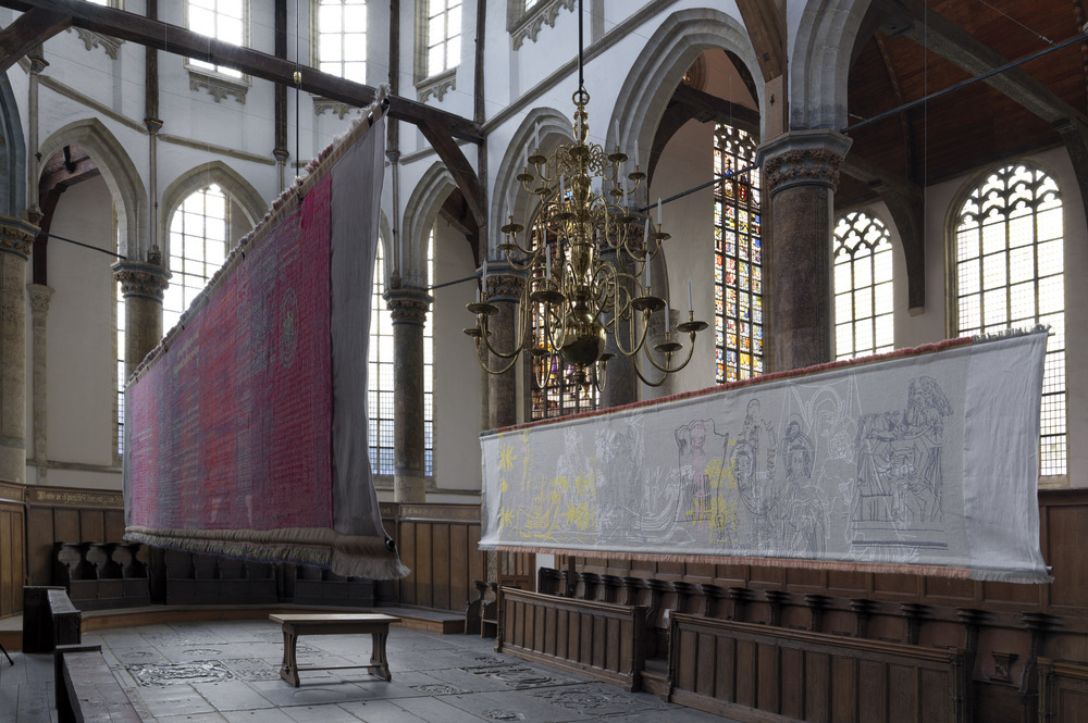 Argentine-Dutch artist Aimée Zito Lema delved into the archives of the Oude Kerk. Interested in moments in history when people resisted, two events in the Oude Kerk caught her eye. The iconoclasm, which took place in the Oude Kerk on 23 August 1566, and the installation of a red window by artist Giorgio Andreotta Calò in the Chapel of the Holy Sepulchre, where a lengthy court case on 17 March 2020 and a ruling by the Council of State, caused long-standing opposition. The traces of both conflicts formed the basic material for Zito Lema's new work, which consisted of photography, Sculptures , Textile works, Poetry , and an installation with Basins .