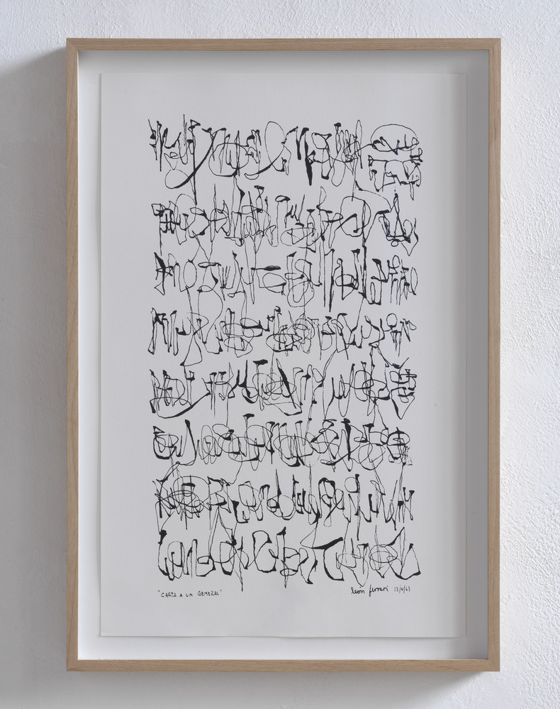 Argentine artist León Ferrari (Buenos Aires, 1920-2013) is considered one of Latin America's most important contemporary artists. In his work, Ferrari responds to the influence of Western, Christian civilisation on South America, the periods of dictatorship in Argentina and the role the church played in it. Letter to a General (Carta a un general, 1963) asks the question: what is being said by this unreadable letter? Both the indefinite article in the title ('a general'/'un general') and the illegibility of the work mean that its meaning is not definitive. It later proved predictive as Argentina's army would be the protagonist of later coups, in 1966 and 1976. Ferrari himself revealed years later that it wasdifficult to write a reasonable letter to a general, one that was artistic and not a mere insult. Faced with the helplessness of not knowing how, unable to express his anger against an illegitimate authority, he chose the illegible script. 'The way of writing, drawing words, is part of their meaning, just like the tone of the voice that utters them. And I write drawings to tell thoughts, images that words cannot tell' (León Ferrari, May 1996).