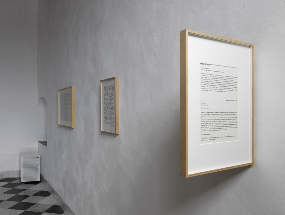 A small presentation of work by Argentinian artist Léon Ferrari (1920-2013), with whom Aimée Zito Lema's work connects, was on display in the lecture room. She grew up with his work. During the lockdown, she delved into his work again. In the context of her research for the exhibition, another connection with his work emerged for her, specifically in the search and questions about the relationship between image and language, in the context of resistance. Thus, the idea of a 'footnote exhibition' of his work was born. Through his poems, collages and even a letter to the Pope, he warned against a "cruelty intimately mixed with the kindness that covers it. The artist's personal life, relationship to religion and the geo-political developments of his time are strongly recognisable in the seven works on paper on display in the College Room.