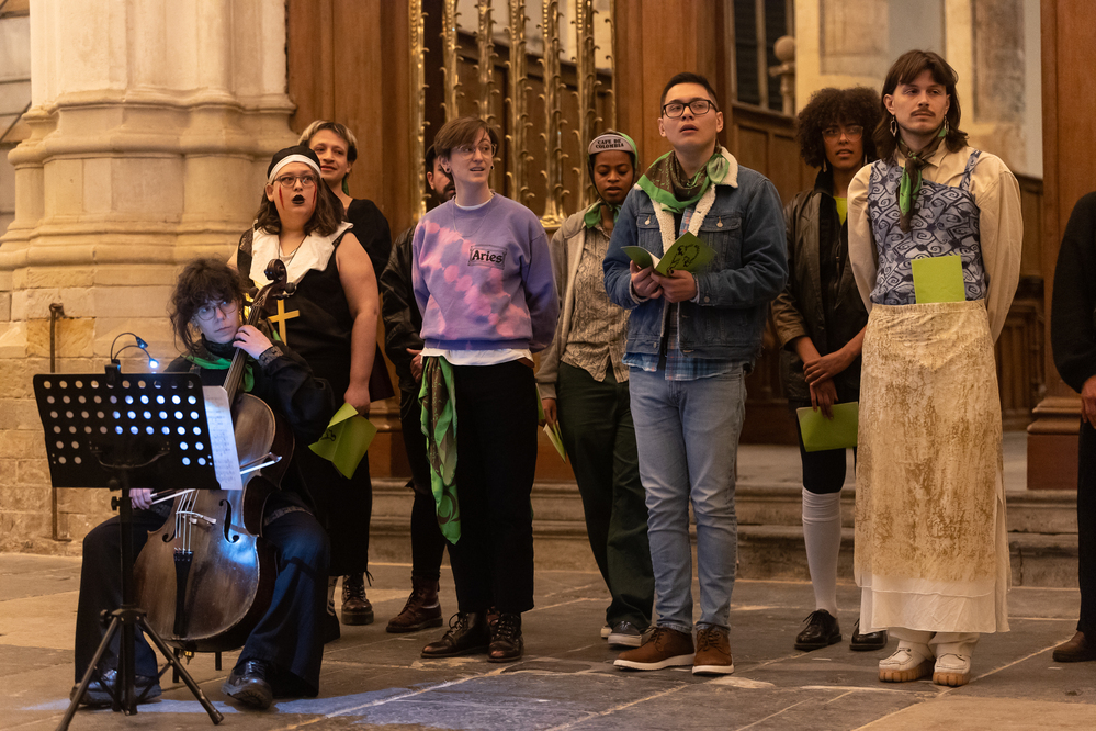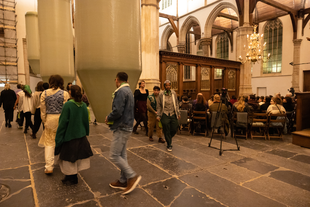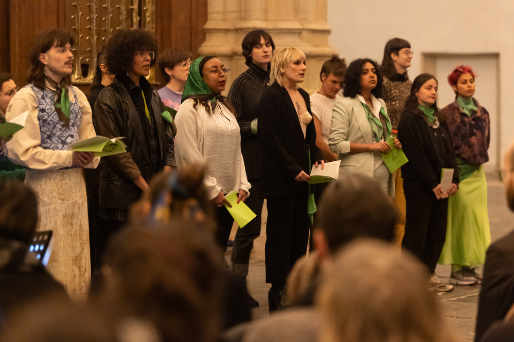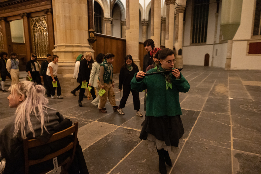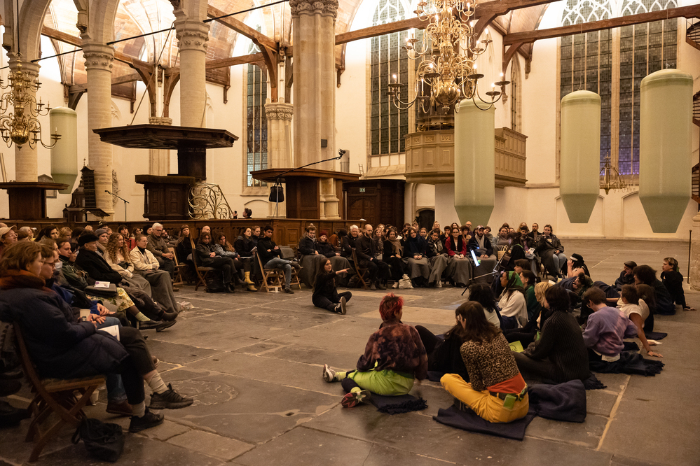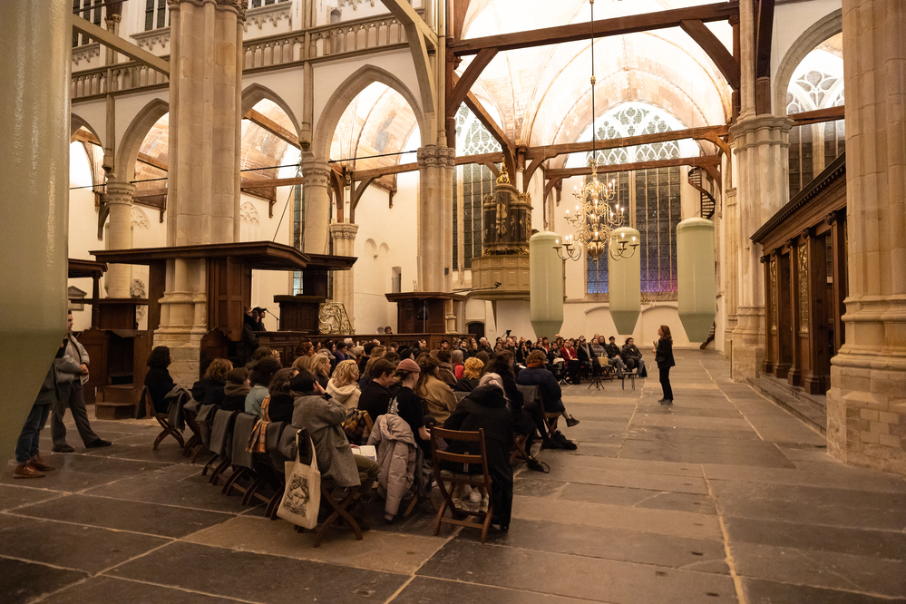 This evening, the Queer Choir Amsterdam presented their first performance, 'The Glitch at Garden's Gate', which used the space of the Oude Kerk to reshape, alienate (as in: 'to queer') the traditional meaning and presentation of a choir. The Queer Choir Amsterdam, which was formed during the first lockdown in 2020 and has been rehearsing together on a regular basis ever since, sang its own work created in a collective process. How does queerness relate to the architecture and history of the Oude Kerk? How to position themselves in this space? The choir explored these questions by not only singing compositions, but also making room for improvisation, glitches (hiccups), moments of quiet and interaction with the audience, with the roles of choir, conductor and listener becoming more intertwined. This resulted in a polyphonic programme of about 45 minutes with songs full of queer determination, resistance and fun. Afterwards, visitors had a chance to chat and the work of Susan Philipsz was turned on, who also uses the 'untrained' voice in her work. With over 200 visitors, the evening was sold out.