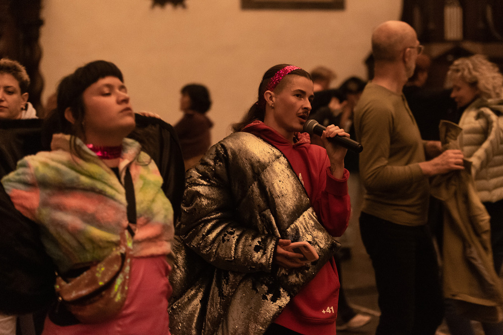 Choreografie collectief Jacuzzi en DJ Lazergazer brachten dans en beweging naar de Oude Kerk. Jacuzzi heeft lange tijd Jacuzzi Mondays georganiseerd voor ‘dansers en niet-dansers’ in de nabijgelegen studio aan de Warmoesstraat. In deze sessies neemt één van de leden of een gast de deelnemers mee in diens performance- en/of danspraktijk. In deze editie van Come Closer werd het publiek uitgenodigd om samen te bewegen en te dansen in het eeuwenoude kerkgebouw.