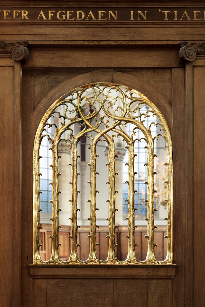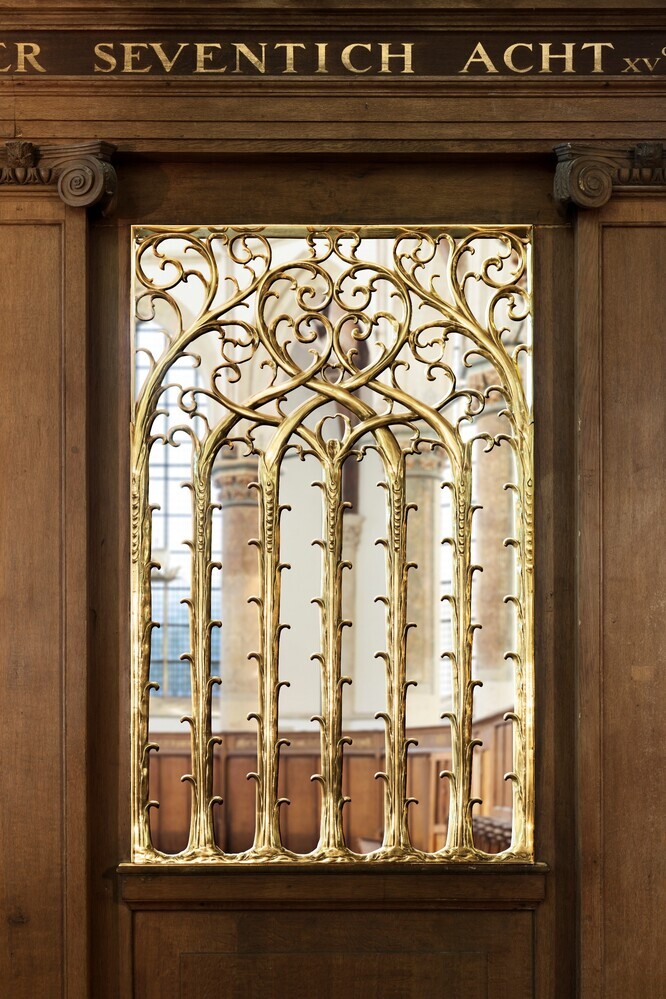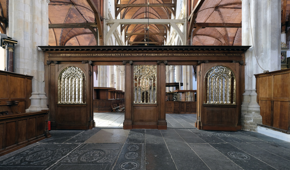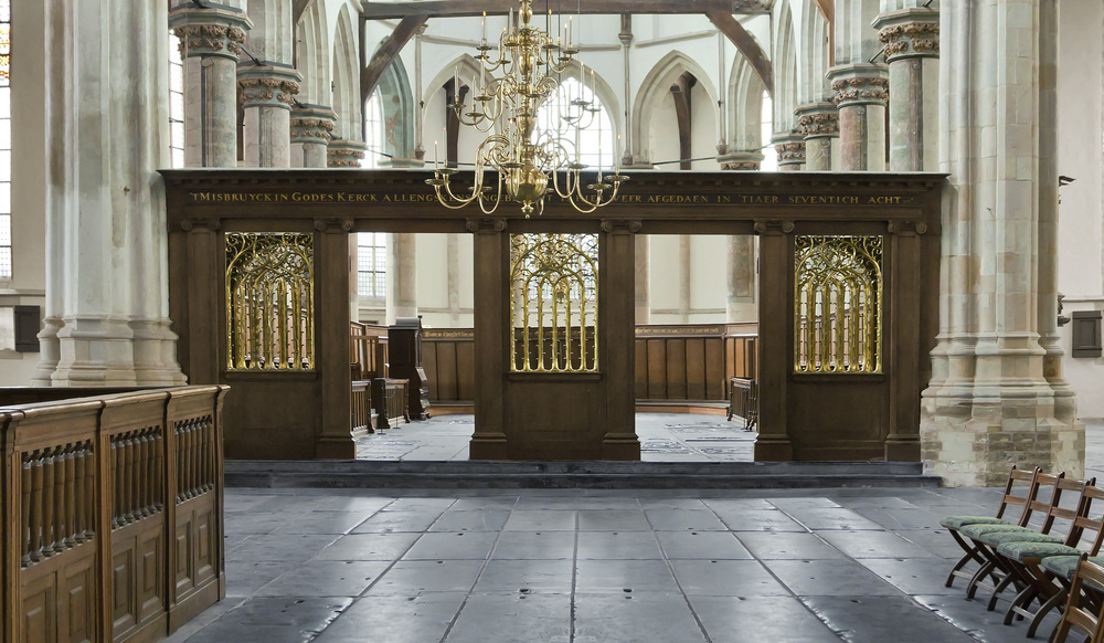 The Oude Kerk commissioned a new choir screen in 1681 in response to the Nieuwe Kerk, which shortly before had commissioned an all-copper choir screen in kwab style. There had traditionally been rivalry between the two churches, and the Oude Kerk's old choir screen could no longer match the splendor of the Nieuwe Kerk's new screen. By choosing a combination of wooden bays and copper bars, the Oude Kerk underscored its longer history and historical importance. The inscription, already on the previous fence, reinforced this message.