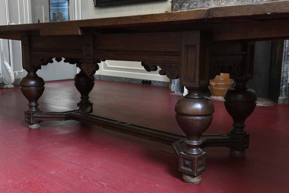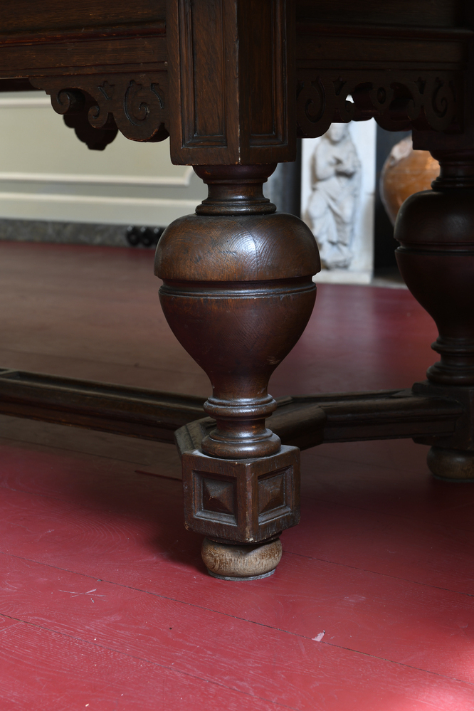 This table, with its striking legs with combined round and rectangular forms, was built circa 1600. The table stands in the Church Warden's Office which was redecorated in the French Style in the late eighteenth century. This renovation involved the walls, the ceiling, the chimneybreast with candleholders and the chairs. The old table with extending leaves was left in place.
