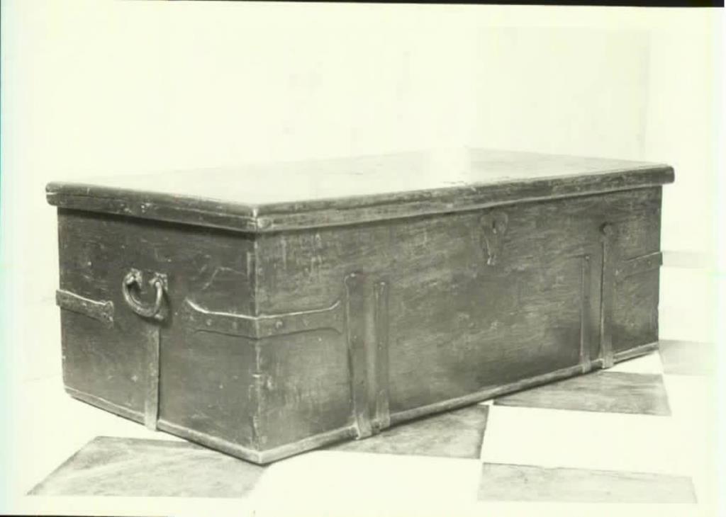 Dark wood, heavy iron fittings with anchor-shaped ends, iron rings as handles and a lock with a fleur-de-lis motif are all features of this oblong chest. In the eighteenth century this piece of furniture, with its protruding plinth and upper edge and slightly overhanging lid, served as a chest for archives.