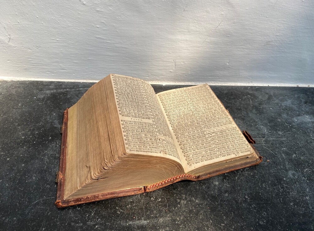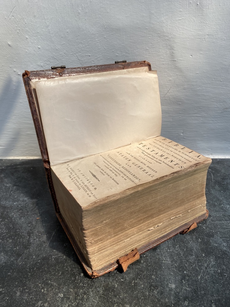 This Bible has an embossed leather binding with two leather clasps to hold it closed. A clasp is a fastening to the front and rear of the cover. On the cover, which has almost come loose, it reads ‘Oude Kerk, V, 1, 1865’. The clasps are missing, but the mounts are still intact. The Acte van Consent authorization was signed in Amsterdam on 5 August 1818 by D. Meijboom.