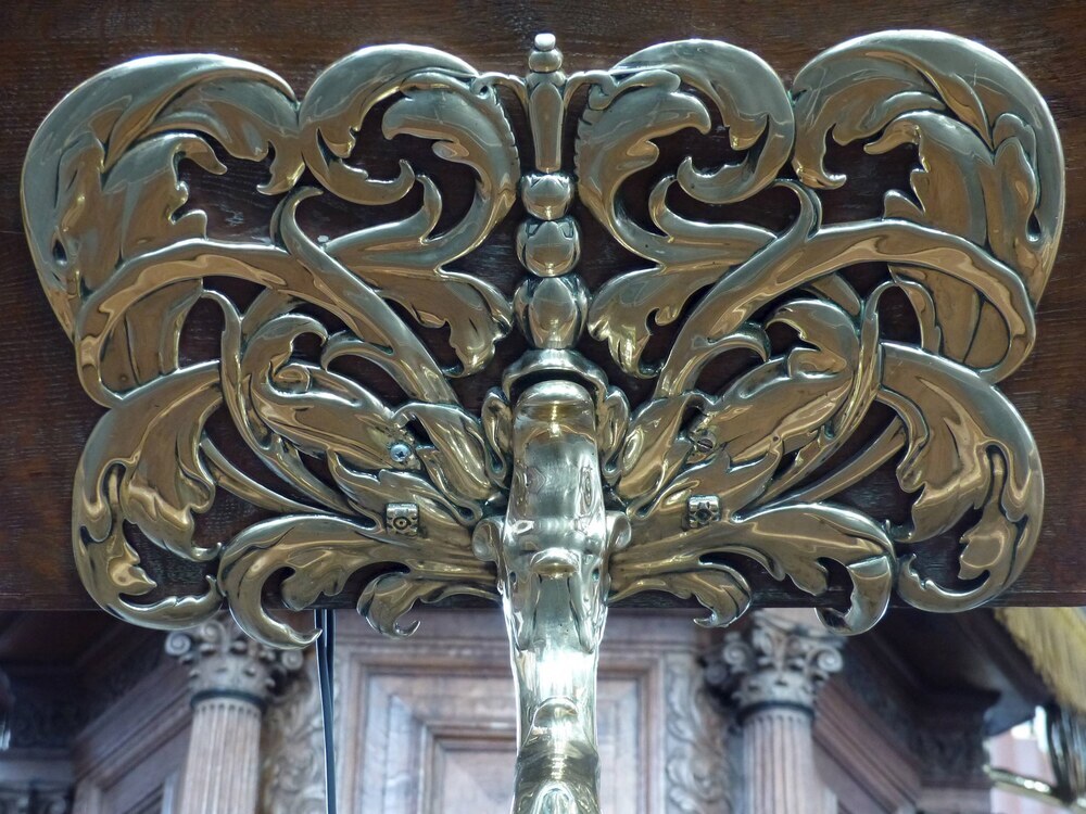 This lectern with stylized dolphin head and leaf motifs is located in the middle of the Oude Kerk on a baptistery screen in front of the Pulpit in kwab style . It is a design by Joost Gerritsz., who also made the yellow-copper balustrade of the pulpit in 1643. The lectern, made between 1642 and 1644, was the first example of a model later used in several churches in the Netherlands. The lectern is part of the readers bench, from which the reader announced which psalm or song would be sung.