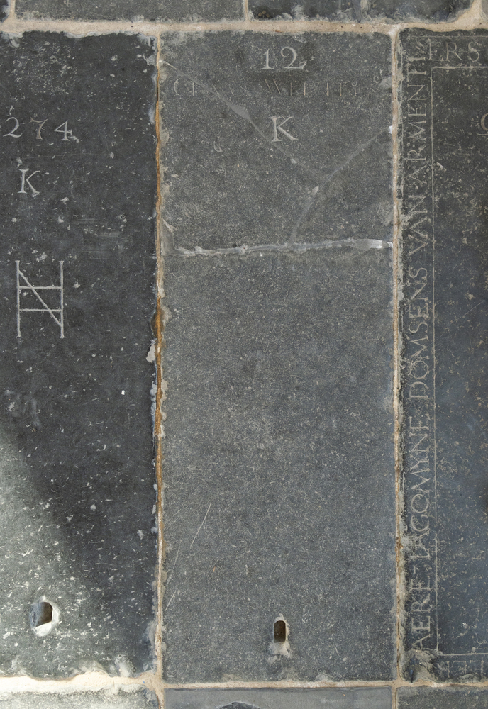 Midden: wapenschild met merk waarin o.m. C en MR en l. en r. een 6-p. ster. Randschrift.